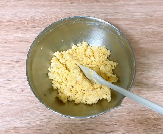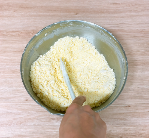 7. 실리콘 주걱을 밑에서 위로 골고루 섞어주며 11자 형태로 그어가면서 반죽이 뭉쳐질 때까지 섞어주세요.