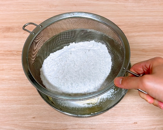 6. 5에 가루류를 체에 쳐서 넣어주세요.