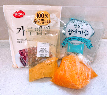 2. 스텐볼에 멥쌀가루와 찹쌀가루, 단호박가루를 넣고 가볍게 섞어주세요. ( 단호박가루는 선택인거 아시죠?? :D )